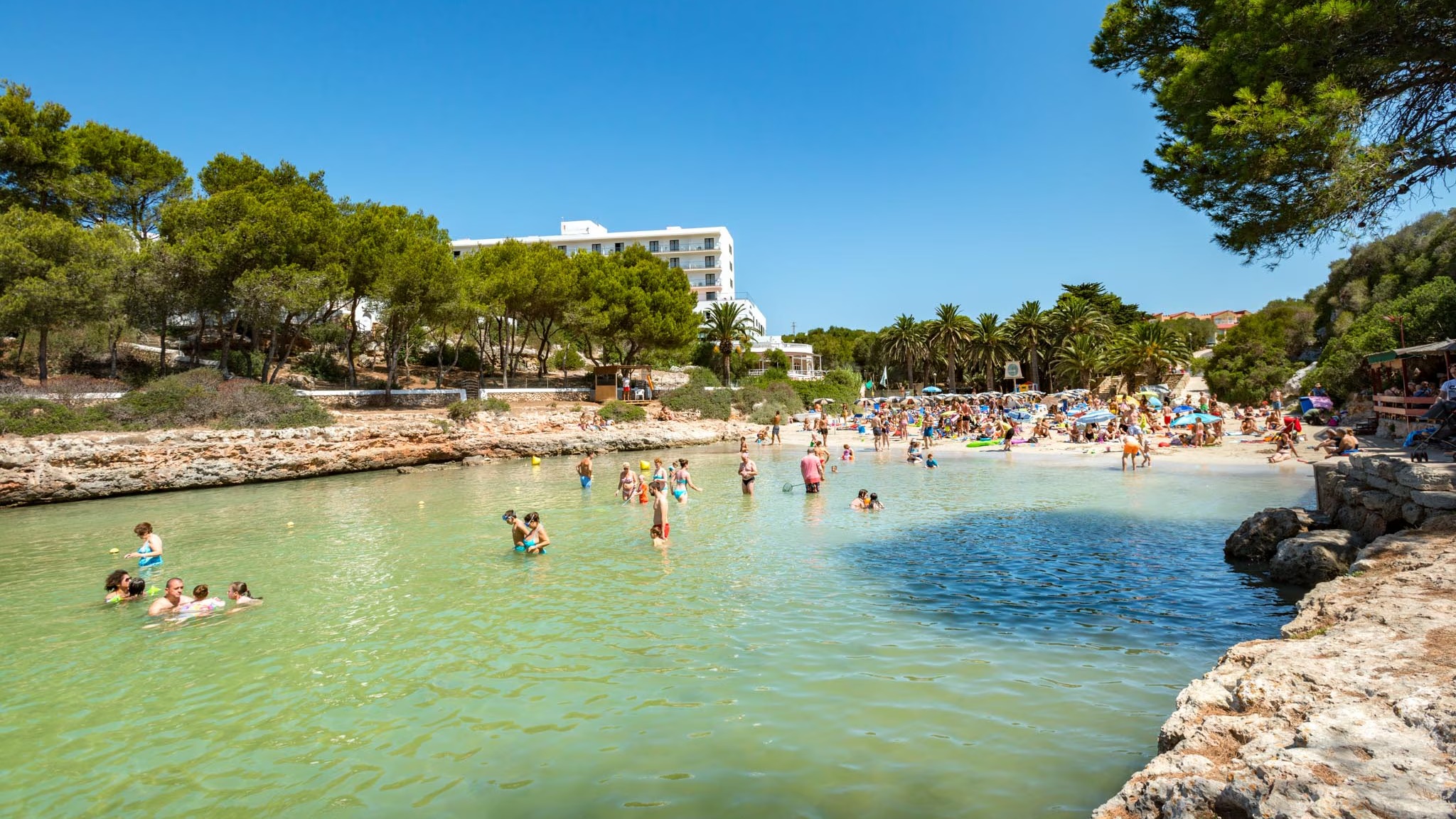 Das erste, was auffällt, wenn man Cala en Blanes erreicht, ist die Existenz eines Palmenhaines auf dem Sand. Es handelt sich um eine ruhige Bucht, mit einer Länge von etwa 40 m, die vor den Winden, die an dieser Küste wehen, geschützt ist. Ganz nahe am Ufer befindet sich ein Hotel, das es uns erlaubt, unvergessliche Ferien mit der ganzen Familie zu erleben. Ausserdem bietet die Feriensiedlung von Cala en Blanes eine grosse Zahl von touristischen Unterkünften sowie eine grosse Vielfalt von Freizeiteinrichtungen, um den Aufenthalt auf der Insel vielseitig zu gestalten. Cala en Blanes befindet sich eine 3 km westlich von Ciutadella. Um sie zu erreichen, muss man die Umgehungsstrasse benutzen, die die Feriensiedlung mit Ciutadella verbindet.