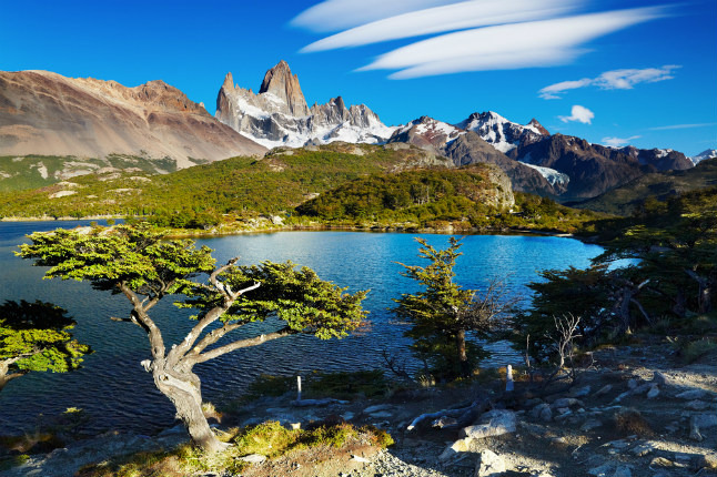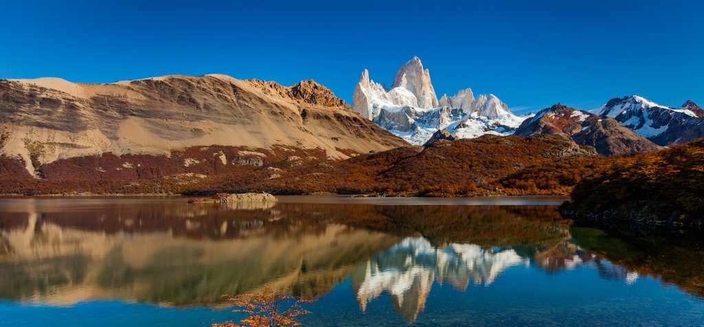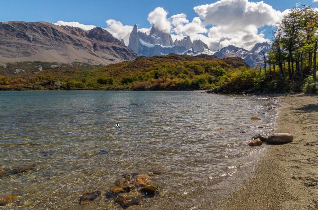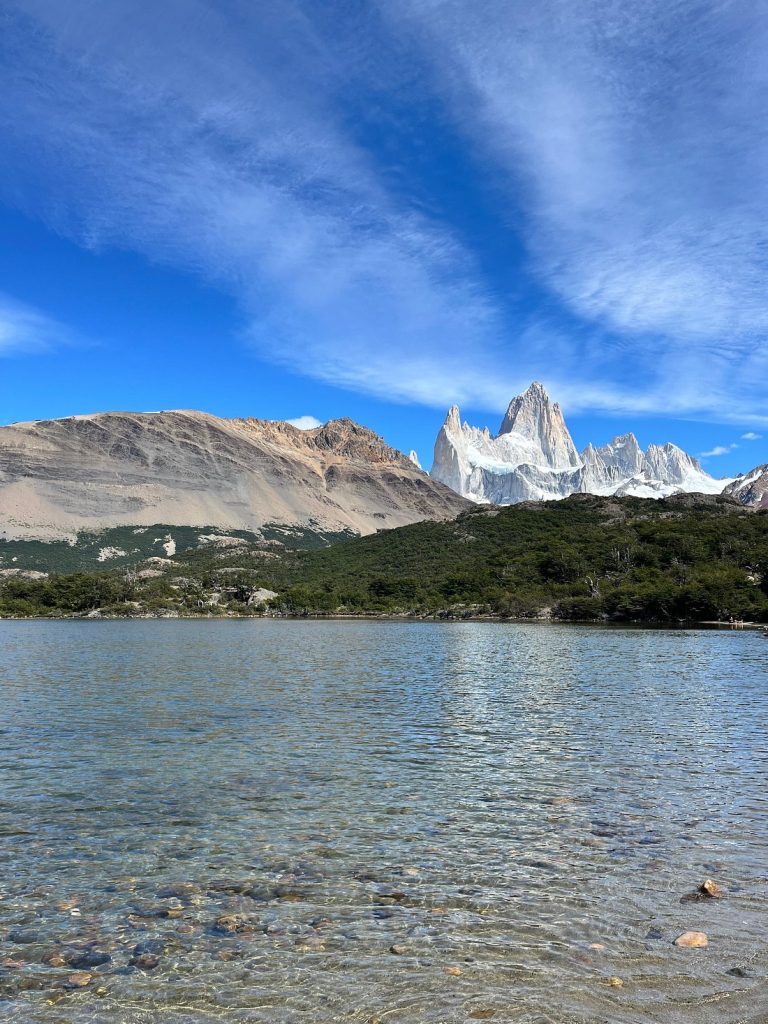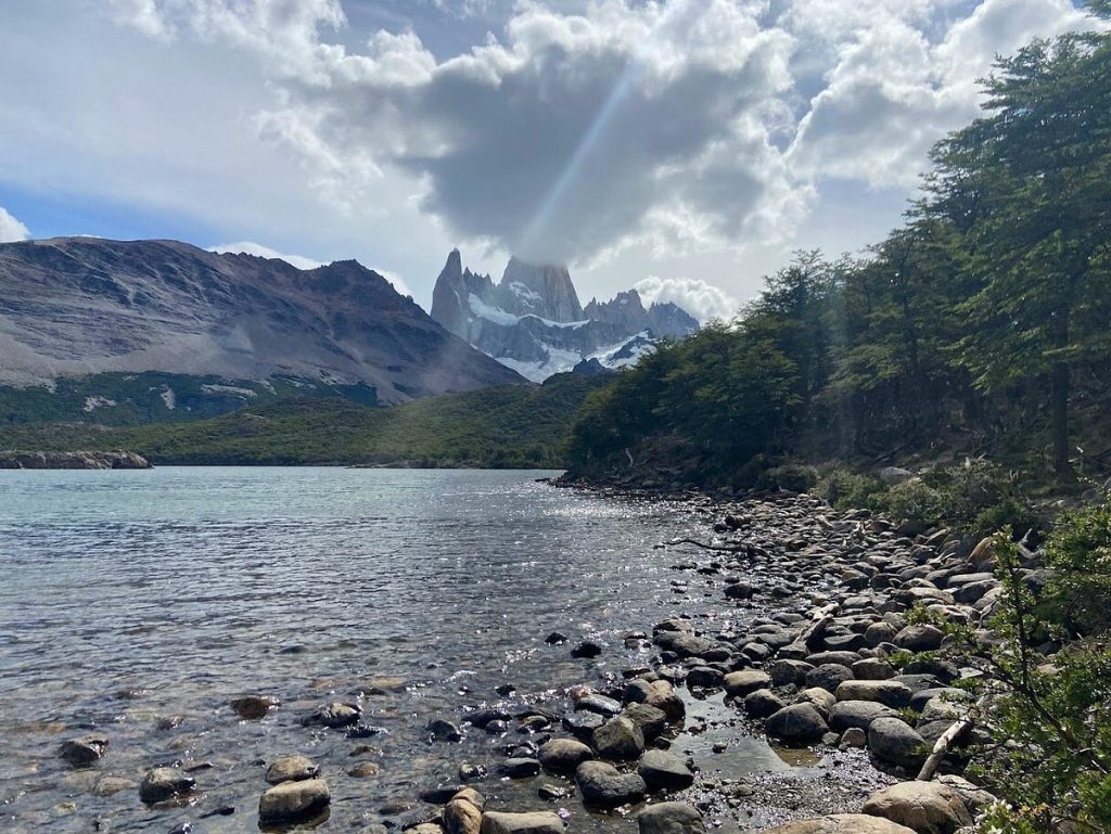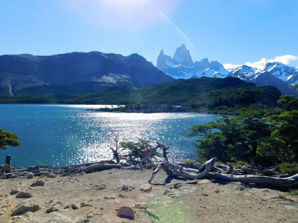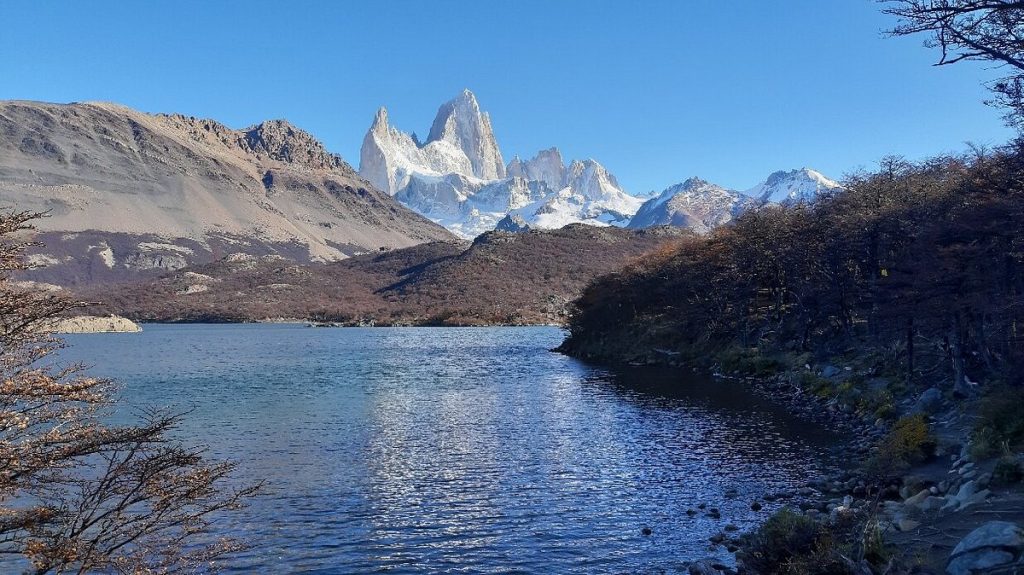 Bei guter Sicht erleben wir darüberhinaus ein eindrucksvolles Panorama mit den Trabanten des Fitz Roy. Nun kann auf derselben Strecke zurück gewandert werden. Doch empfehlenswert ist die Variante (Hinweisschild am See), über einen schmalem Pfad in einer Schleife zum Aussichtspunkt «Mirador del Fitz Roy» zu gelangen. Wenn wir Wetterglück haben, ist von hier aus der prachtvolle Fitz Roy und die türkisfarbenen Gletscherströme recht nah zu sehen.