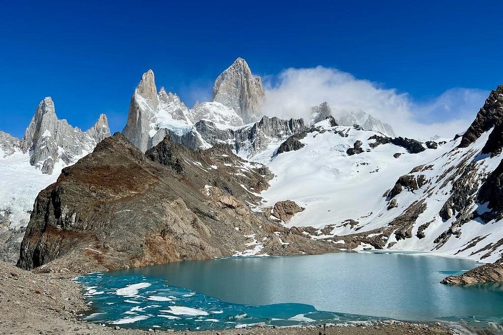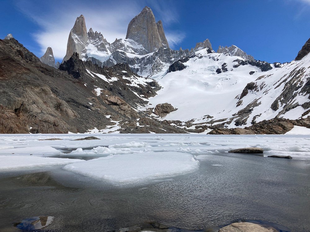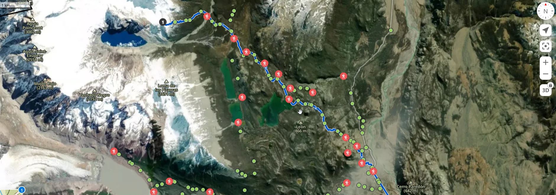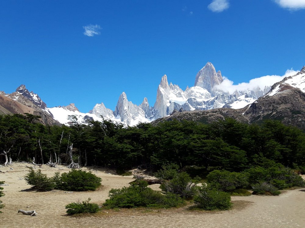 Der Weg endet auf dem Kamm der alten Stirnmoräne des De los Tres-Gletschers (ein riesiges, bogenförmiges Gebilde, in dem sich heute die Lagune befindet, die durch den Vorstoß und den anschließenden Rückzug des Gletschers entstanden ist) und bietet einen außergewöhnlichen Blick auf die Lagune und den De los Tres-Gletscher. Von hier aus hat man den besten Blick auf die Granitwand des Mount Fitz Roy und die umliegenden Gipfel.