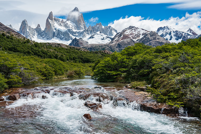 Der Weg führt weiter hinauf entlang des Baches Del Salto, der das Tal in Richtung des Berges Fitz Roy betritt. Nach etwa anderthalb Stunden erreichen Sie einen gut markierten Aussichtspunkt auf einem natürlichen Felsen mit einem Schild, das Ihnen die Interpretation der gesamten unvergesslichen Landschaft ermöglicht.