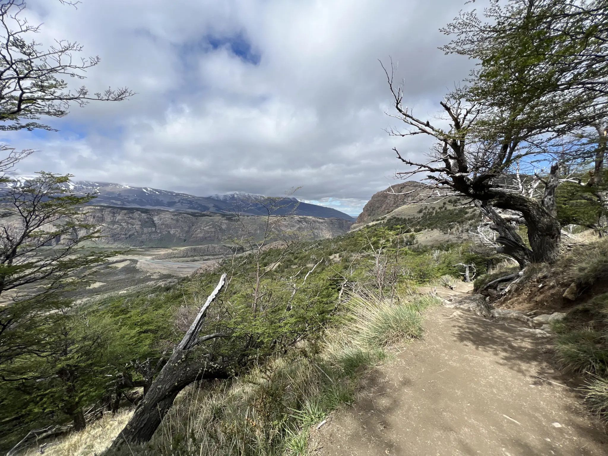 Der Wanderweg beginnt am Ende der Avenida San Martín, wo das Stadtgebiet von El Chaltén endet und sich der Parkplatz befindet. Während der ersten Stunde der Wanderung führt der Weg steil hinauf zu einem natürlichen Aussichtspunkt auf das Tal des Flusses De las Vueltas.