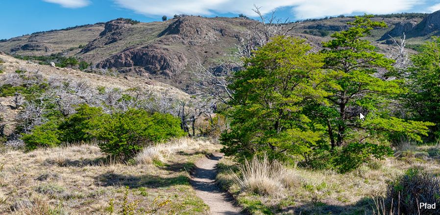 Am Holzschild beginnt der Weg den Hang hinauf. Sehr bald wird es flacher und man hat einen guten Blick auf El Chaltén. Bei km 0,52 (464m) kommst du an einer APN-Station vorbei, wo dich der Parkranger fragt, ob du die Vorschriften des Parks kennst, und sie dir erklärt, wenn du sie nicht kennst.