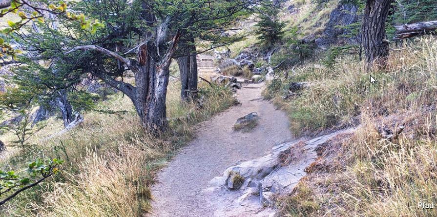 Die Route geht weiter ansteigend mit mässiger Steigung zwischen verstreuten Lenga-Hainen. Kurz darauf mündet der Weg, der von Norte del Chaltén kommt. Es folgt der wichtigste Anstieg der gesamten Strecke, der zum Teil auf grossen flachen Steinen erfolgt. Kurz nachdem wir an einer Süsswasserquelle vorbeigekommen sind, erreichen wir bei km 2,9 (610 m) den Aussichtspunkt Cerro Torre, eine mit einem Geländer versehene Promenade mit einem fantastischen Panoramablick auf den Cerro Torre, den Grande-Gletscher, die Adela-Bergkette, die Loma de las Pizarras auf der rechten Seite und den Paso de las Agachonas.