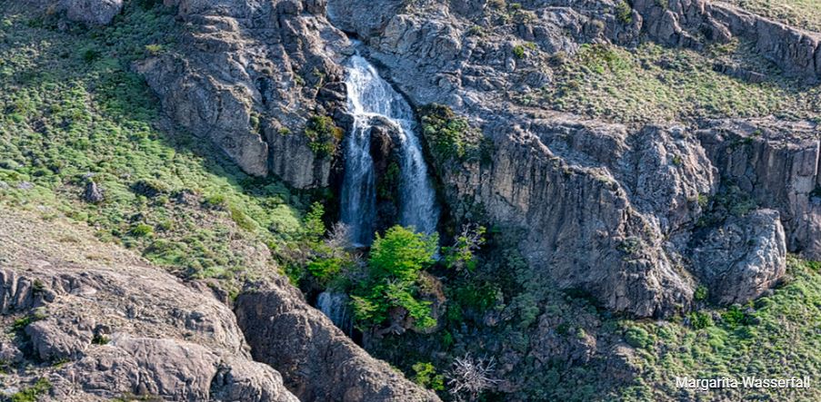 Dann nähert sich der Weg dem Fluss Fitz Roy und führt durch einen steilen Sektor, in dem es Ketten gibt, die den Aufstieg erleichtern (es ist nicht SO steil; die Ketten sind für ältere Menschen gedacht). 35 Meter später erreichen Sie den Aussichtspunkt des Margarita-Wasserfalls (km 0,97 – 488 m), der sich am gegenüberliegenden Ufer des Flusses befindet. Es ist ein sehr bescheidener und unattraktiver Sprung.