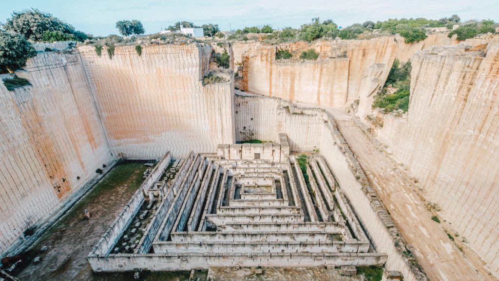 Der Steinbruch lädt dazu ein, durch eine Landschaft zu schlendern, die aus Gärten, Labyrinthen und gemeisseltem Stein besteht, in der Felsen und Vegetation miteinander harmonieren. Die gewaltigen Steinwände, mit einer skulpturähnlichen Felsensäule, die das ganze Gelände zu dominieren scheint, kontrastieren mit dem Innenbereich, der üppig und reich an Vegetation ist. Vom Mittelalter inspirierte Gärten, von kretischen Traditionen angeregte Labyrinthe aus Pflanzen und Stein, in denen man sich verirren – und wiederfinden – kann, laden den Besucher ein, ihren Zauber zu entdecken.