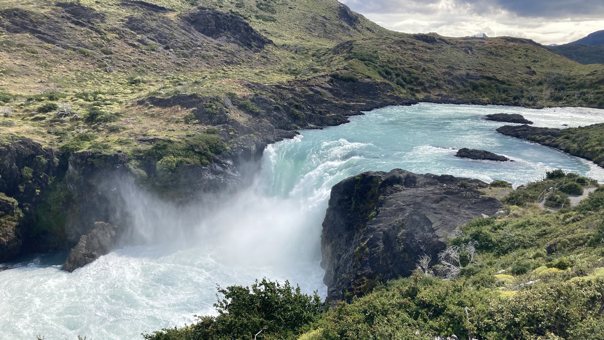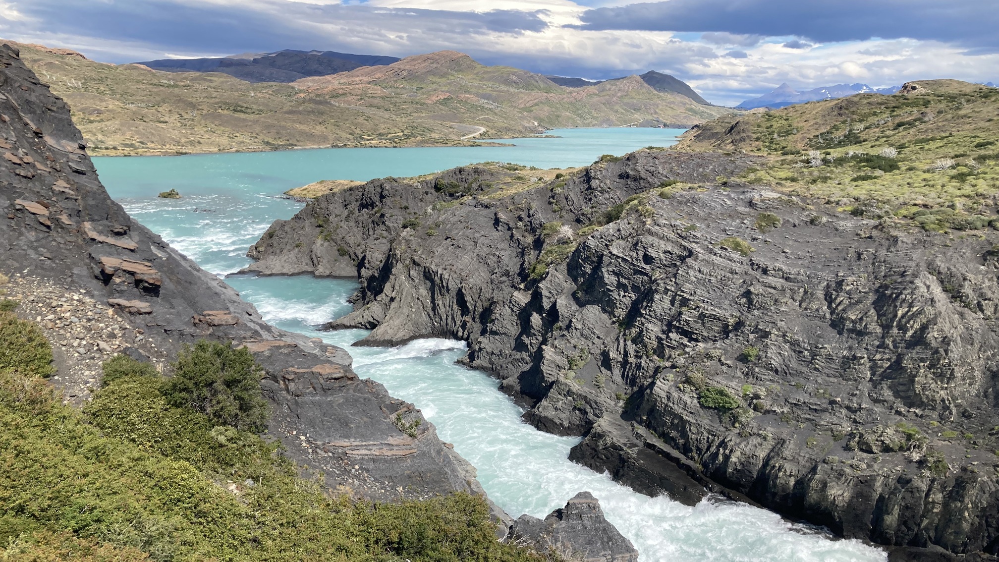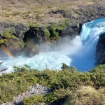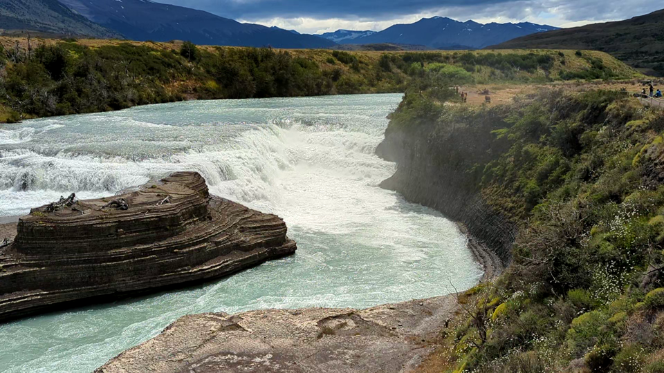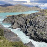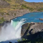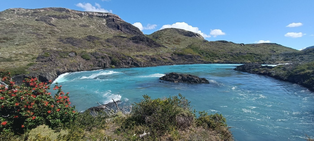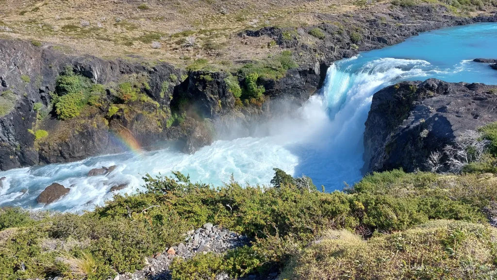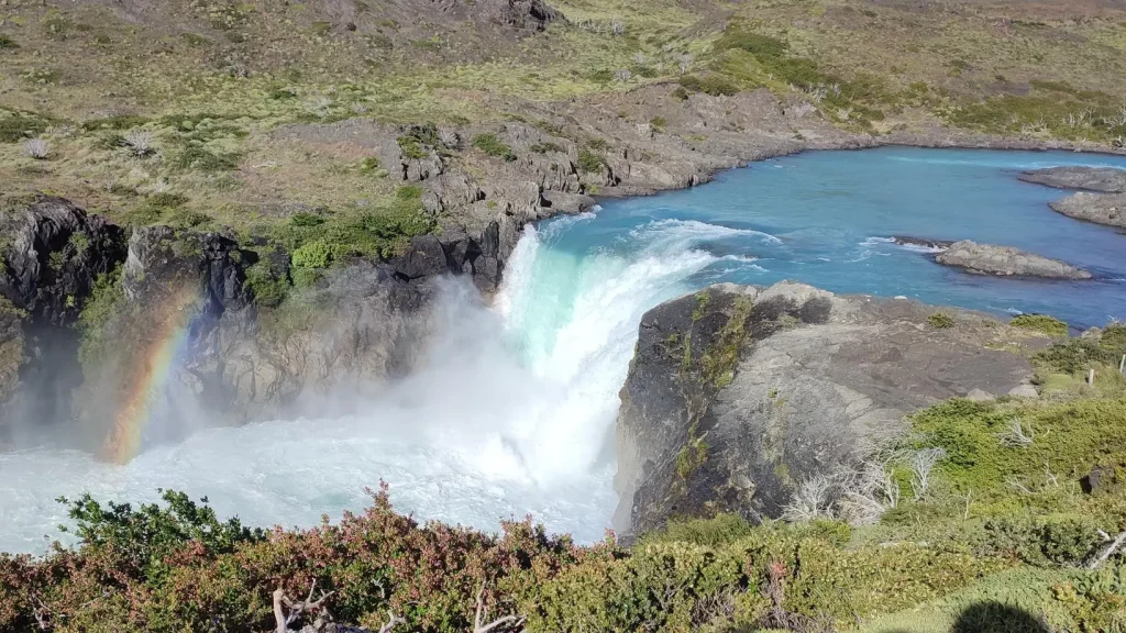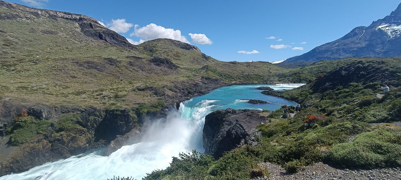 Angrenzend an den Pehoe-See können wir unser nächstes Ziel sehen: einen atemberaubenden Wasserfall namens Salto Grande (Großer Sprung). Um zu seinem Aussichtspunkt zu gelangen, haben wir uns dieses Mal für den Transport mit dem Auto entschieden, wie es viele Touristen tun, die die Gegend besuchen, und den Pier zu benutzen, der den See mit dem Pudeto-Sektor verbindet.