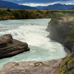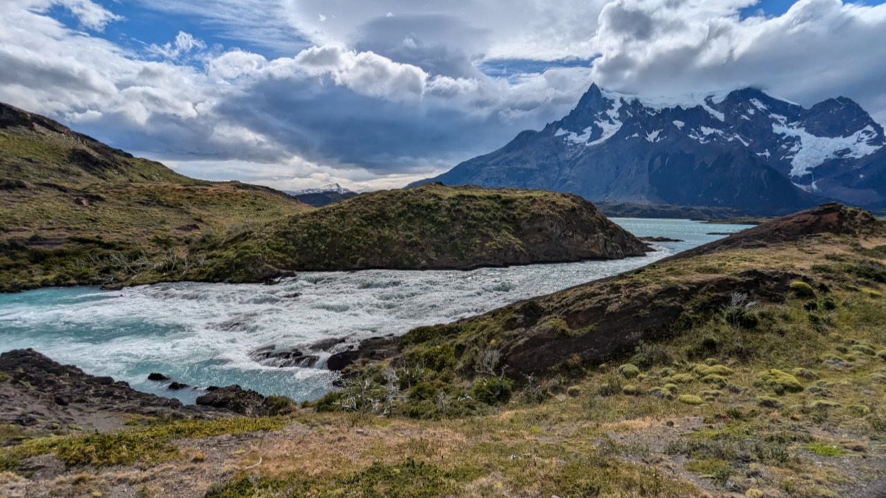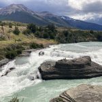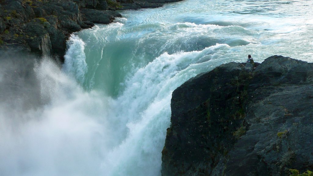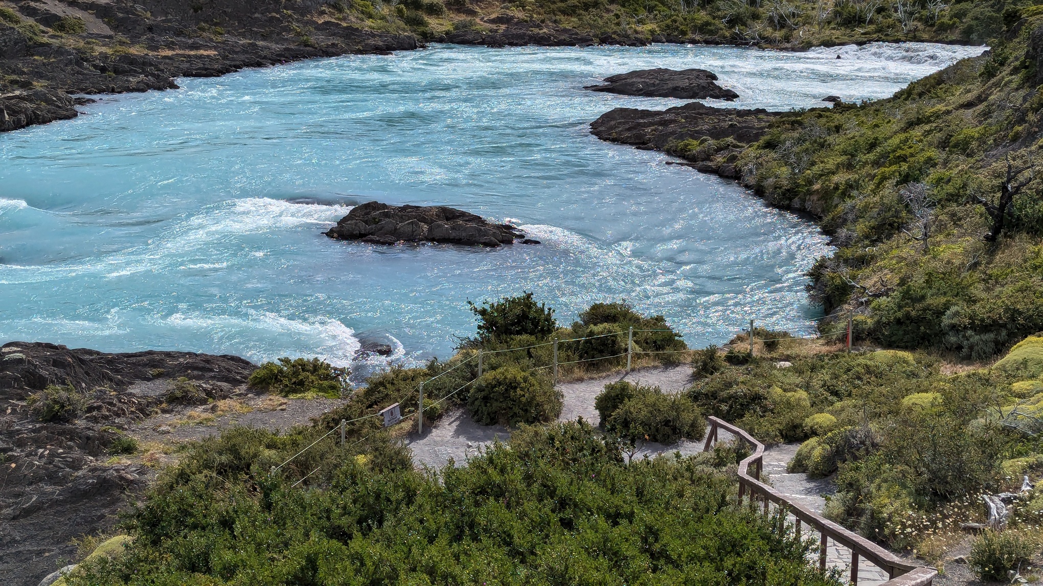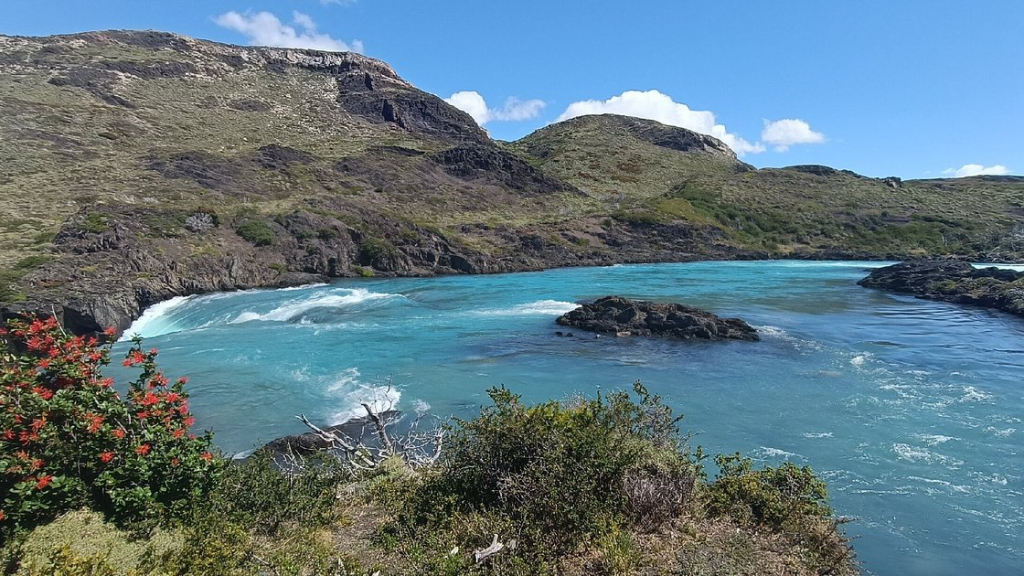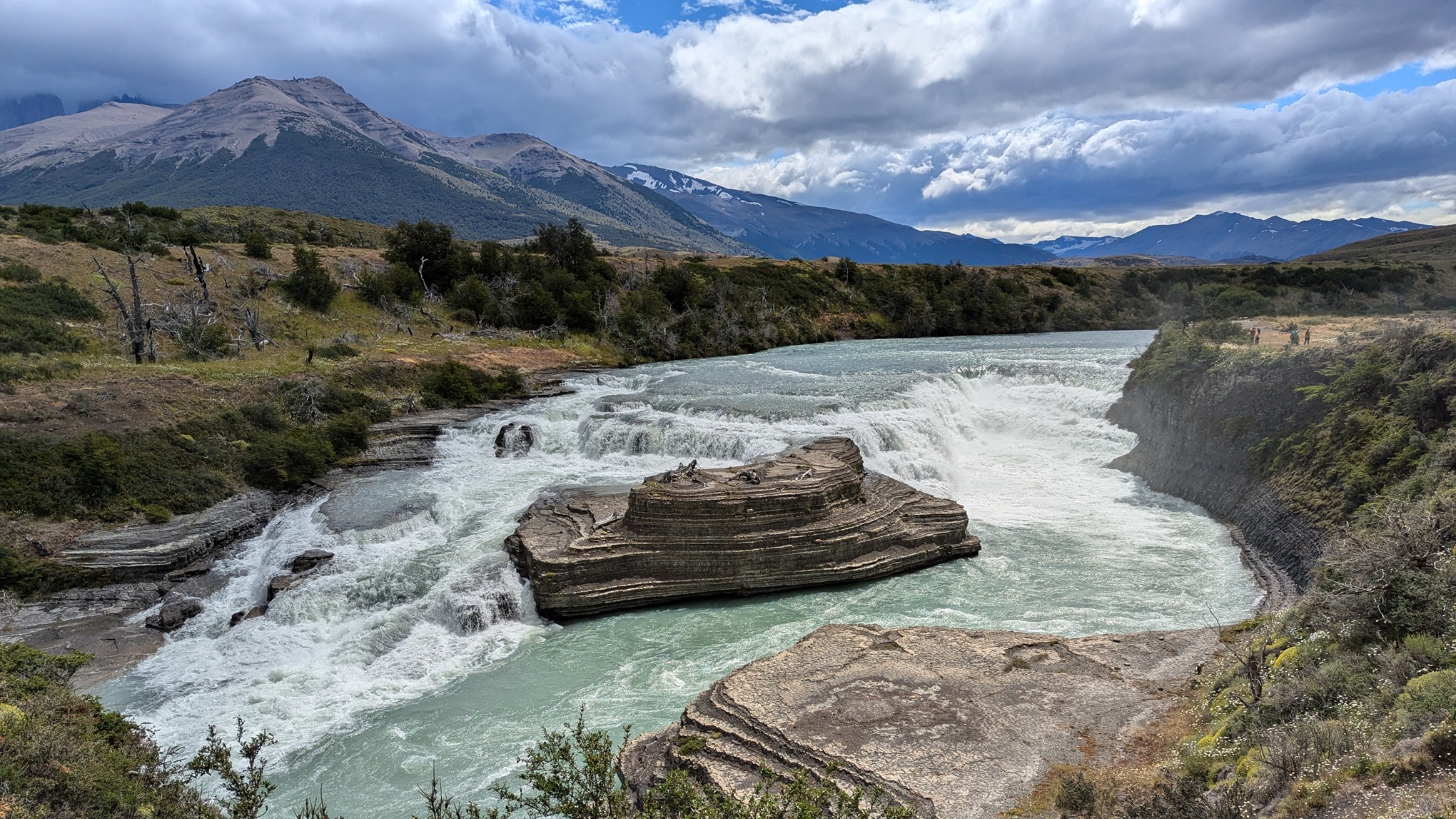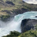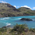Angrenzend an den Pehoe-See können wir unser nächstes Ziel sehen: einen atemberaubenden Wasserfall namens Salto Grande (Großer Sprung). Um zu seinem Aussichtspunkt zu gelangen, haben wir uns dieses Mal für den Transport mit dem Auto entschieden, wie es viele Touristen tun, die die Gegend besuchen, und den Pier zu benutzen, der den See mit dem Pudeto-Sektor verbindet.