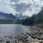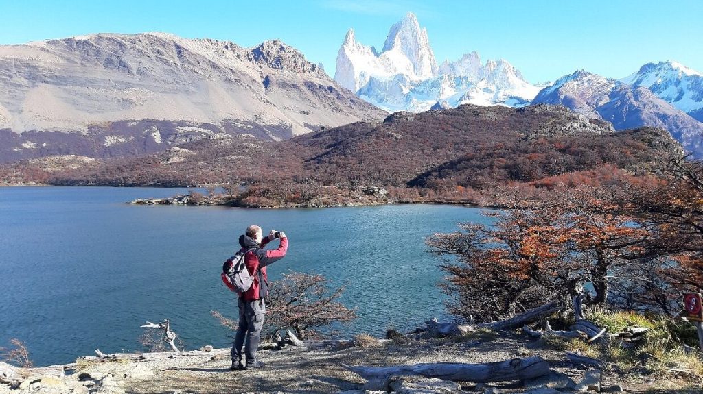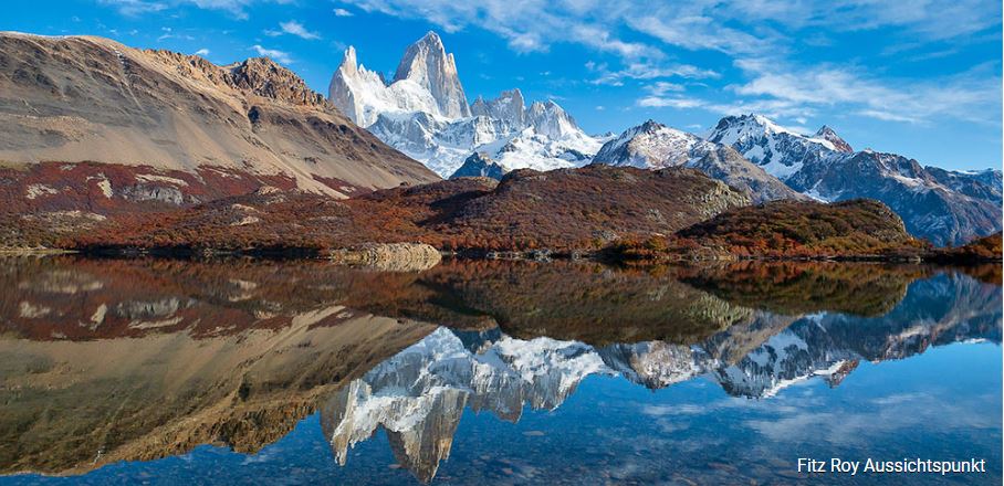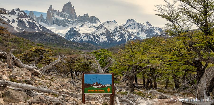 Bei guter Sicht erleben wir darüberhinaus ein eindrucksvolles Panorama mit den Trabanten des Fitz Roy. Nun kann auf derselben Strecke zurück gewandert werden. Doch empfehlenswert ist die Variante (Hinweisschild am See), über einen schmalem Pfad in einer Schleife zum Aussichtspunkt «Mirador del Fitz Roy» zu gelangen. Wenn wir Wetterglück haben, ist von hier aus der prachtvolle Fitz Roy und die türkisfarbenen Gletscherströme recht nah zu sehen.