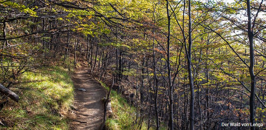 Zurück auf dem Aufstiegsweg steigen wir wieder abwärts zum Ausgangspunkt. Mit Glück sehen wir im Wald den prächtigen Magellanspecht, das Männchen zeigt einen leuchtend roten Kopf zum sonst schwarzen Gefieder.