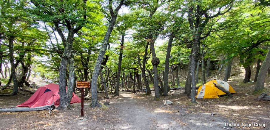 Anschließend durchquert der Weg dieses Tal und führt durch Wälder mit einheimischen Bäumen bis zum Ufer der Lagune von Capri. Von hier aus hat man einen schönen Blick auf den Cerro Fitz Roy, und wenn man noch ein paar Meter weitergeht, erreicht man den Campingplatz Laguna Capri.